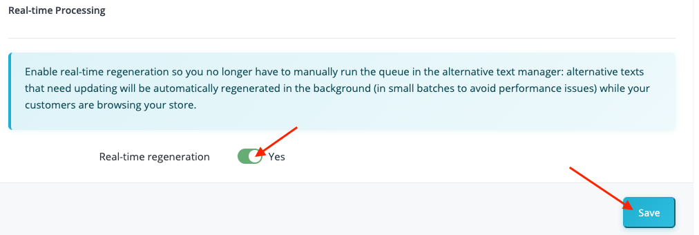 Enable real-time regeneration so that alternative texts that need updating are automatically regenerated in the background as your customers browse your shop. This saves you from having to manually process the queue in the alternative texts manager (see section 3) to update them. Processing is carried out in small batches to avoid any performance issues.