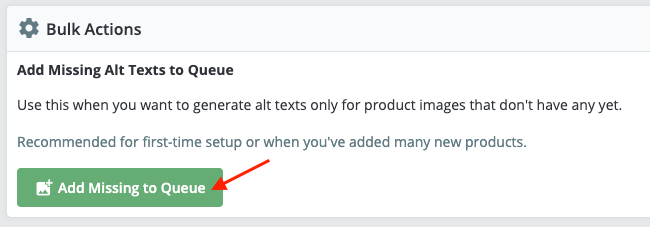 - On the green button "Add missing to queue" to add to the queue only images that do not yet have alternative text (recommended after a catalog import):