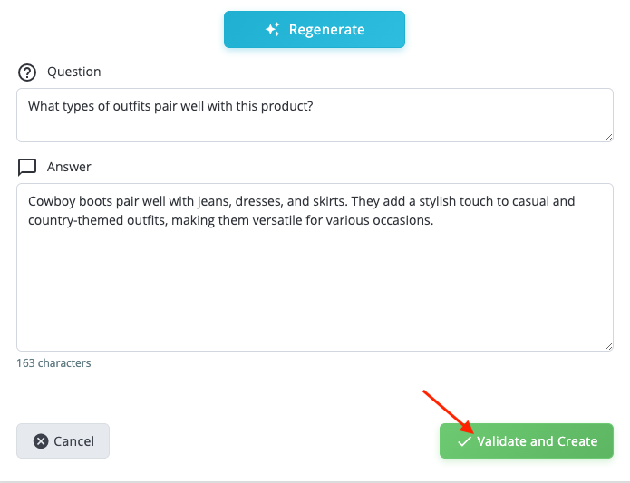 The new question and answer, adapted to the new context, appear. You can modify manually or regenerate with AI again if the question or answer do not suit you, or click "Validate and create" to save and publish the new FAQ: