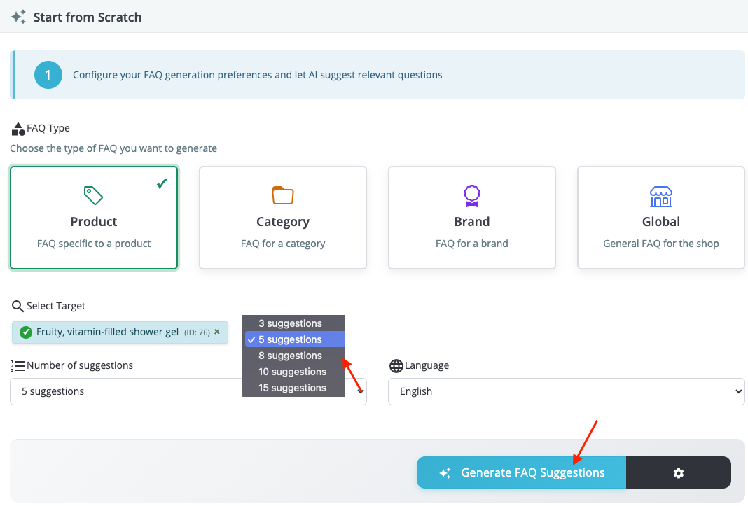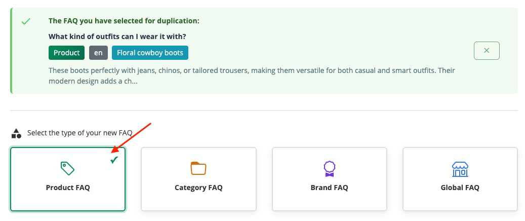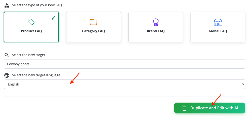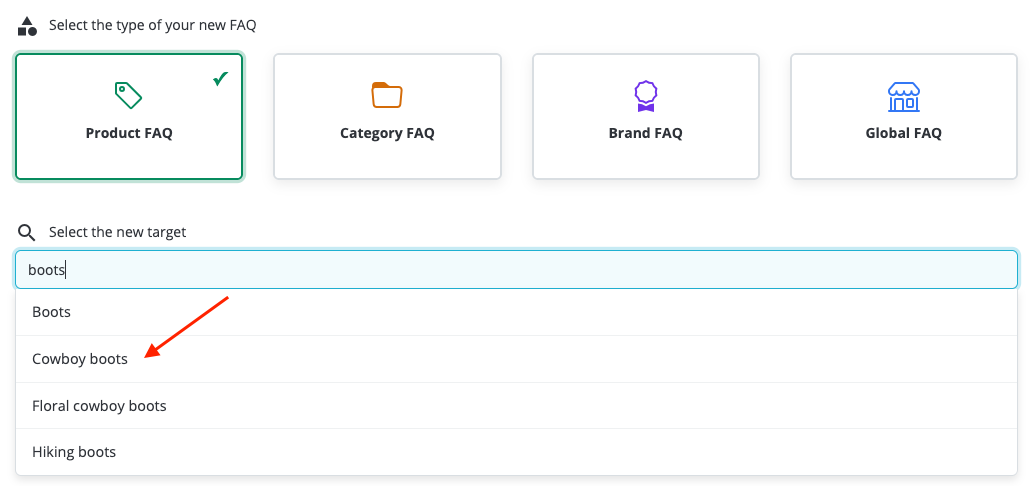 - Type of the new FAQ: Product, category, brand, or global FAQ