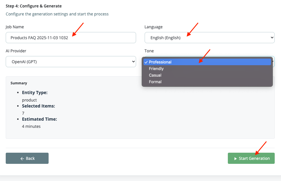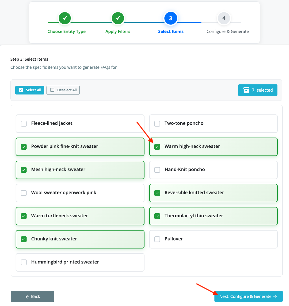 Select the target entities (for products, you must first choose the category, then select the products to generate FAQs for) and click "Next: Configure & Generate":