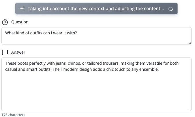 How AI generation works: Artificial intelligence helps you write your questions/answers by analyzing your product, category, or page content (description, features, customer reviews). It identifies the questions your customers might ask. It then generates relevant answers based on this information, using a professional tone adapted to e-commerce.