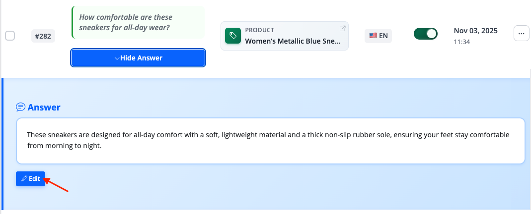 Click "Regenerate" if the answer does not suit you and you want the AI to generate a new one, click "Discard" if you want to go back to manual editing, or confirm by clicking "Use this Answer". You can always further edit your FAQ fields after validating the answer generated by the AI. - Enable the FAQ: publish your FAQ straight after saving, or leave it disabled for later publication.