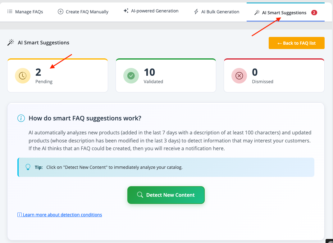 How smart detection works: The AI automatically analyzes new products (added in the last 7 days with a description of at least 100 characters) and updated products (whose description has been modified in the last 3 days) to detect information that may interest your customers. If the AI considers that a FAQ could be created, you will receive a notification in the FAQ manager.