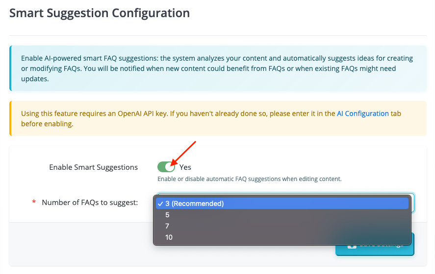 Start by activating smart suggestions by going to the FAQ > AI Smart Suggestions tab and setting the number of FAQs to suggest (3 FAQs recommended):