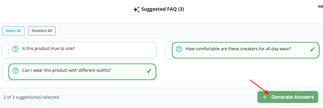 The AI can also help you bulk generate your FAQs for one or more products, categories, or brands.
