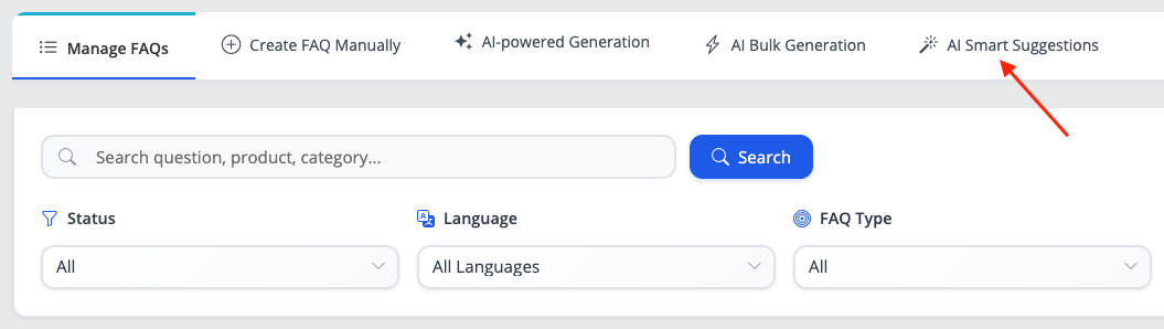 In the FAQ manager, click the AI Smart Suggestions tab: