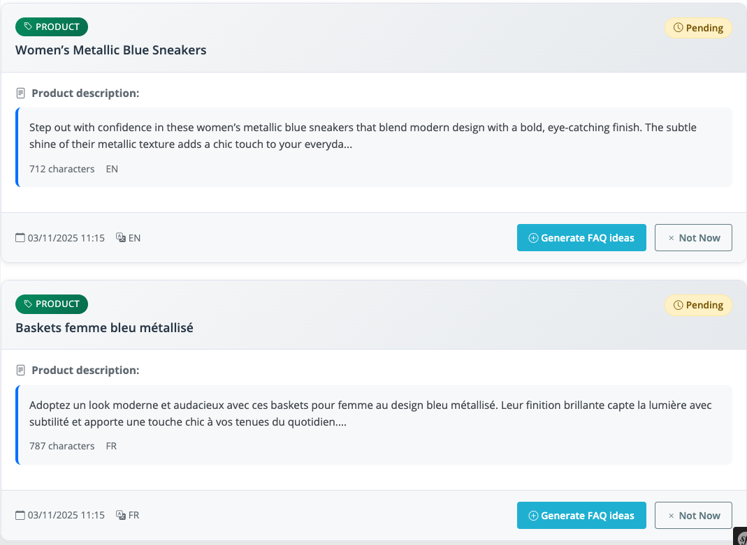 Example: here, a new product was created and its description filled in two languages. So there are 2 "elements" (one per language) for which the AI can suggest FAQs: