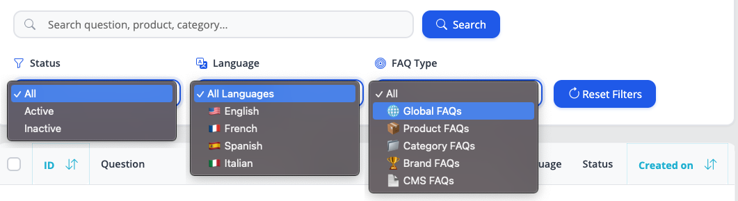 The FAQ manager offers comprehensive tools to organize, filter, and manage your FAQs.