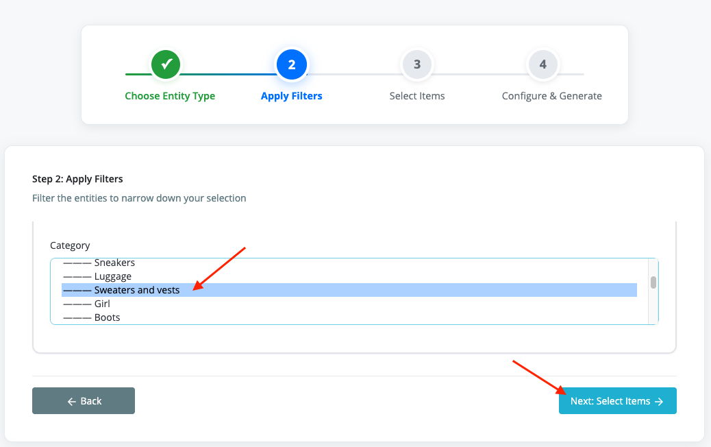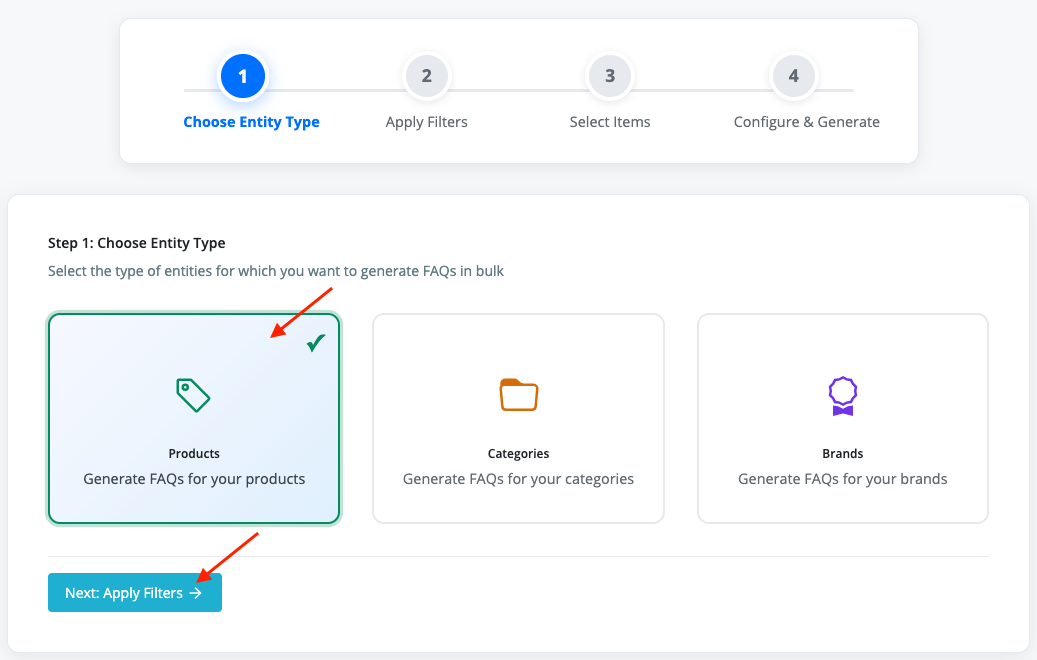 Start by selecting the type of entities for which you want to bulk generate FAQs (in the example below, bulk FAQs for multiple products are chosen), then click "Next: Apply Filters":