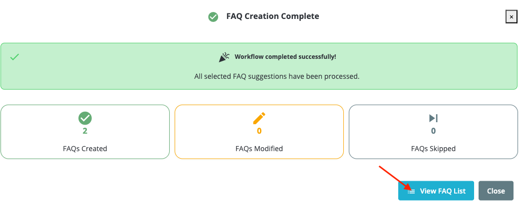 Finally, click "View FAQ list" to return to the FAQ manager, or "Close" to move on to other smart suggestions.