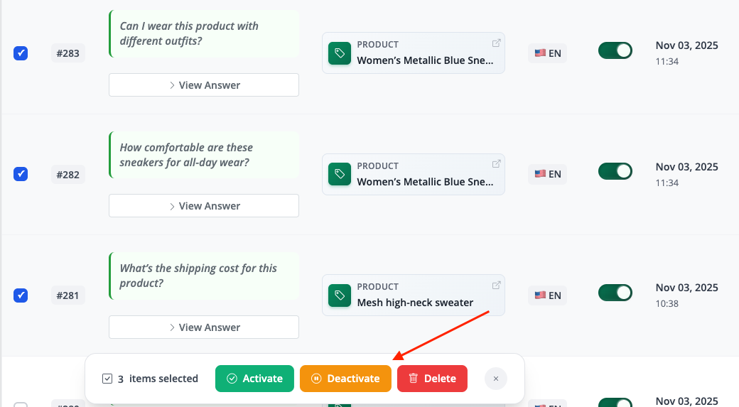 Deselect those you don't want. Keep selected only the ones for which you want to generate an answer. You will be able to check the answers, and modify them if needed, at the next step. Click "Create selected FAQs".