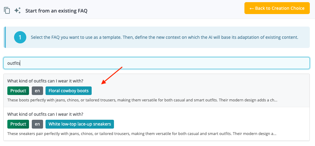Benefits of duplication: This method improves quality by providing the AI with FAQs you have already validated. By basing itself on these contents, and analyzing the new context (different products, categories, etc.), it will be able to optimize the quality of the generated FAQs.
