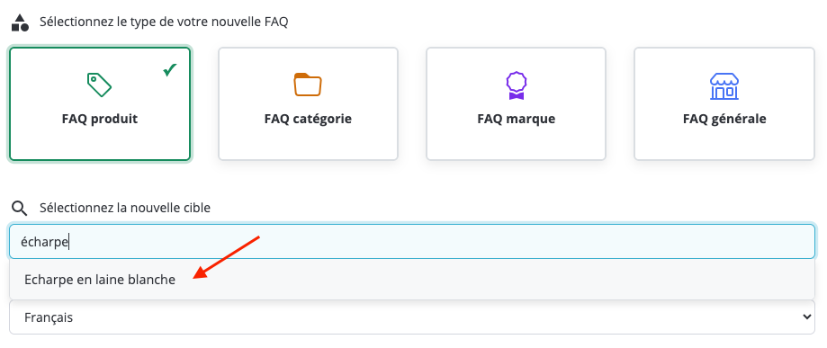 - Le type de la nouvelle FAQ : Produit, catégorie, marque ou FAQ générale