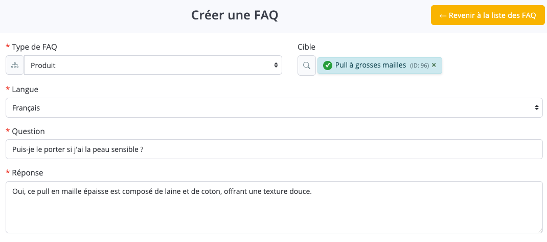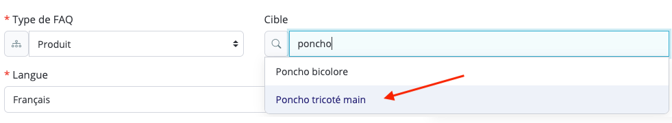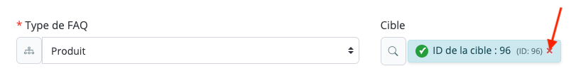- Cible : en fonction du type de FAQ, sélectionnez l'élément concerné (le produit, la catégorie ou la marque)
