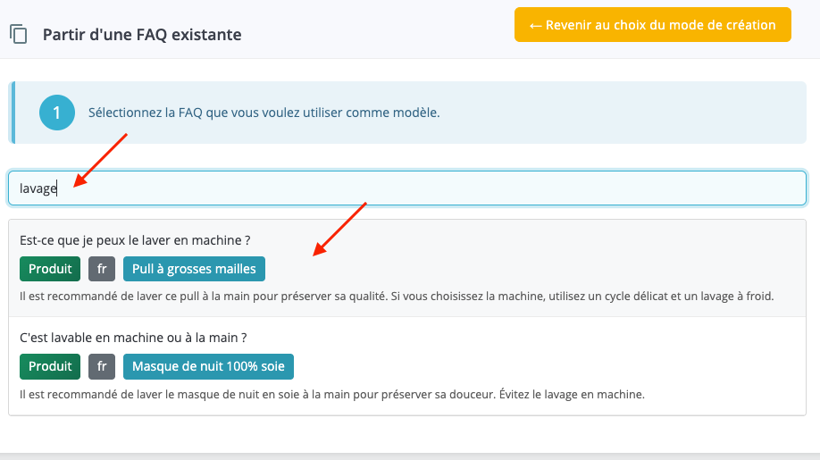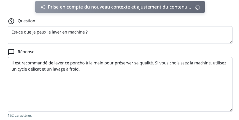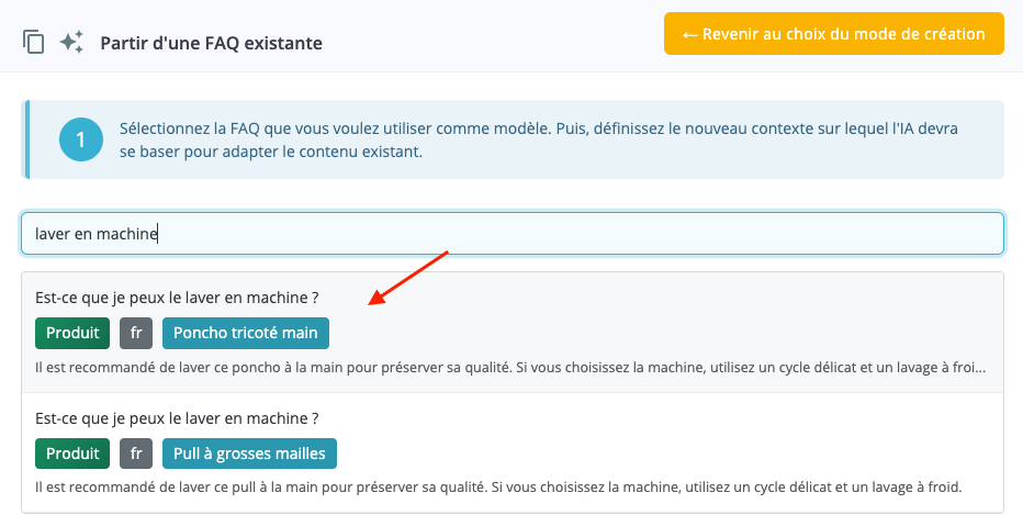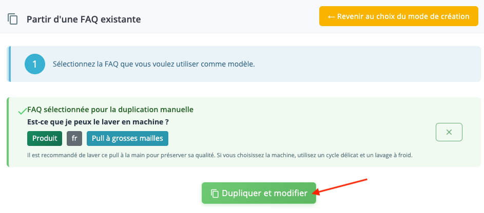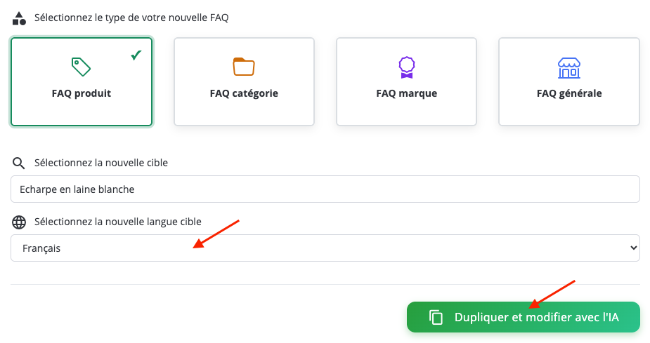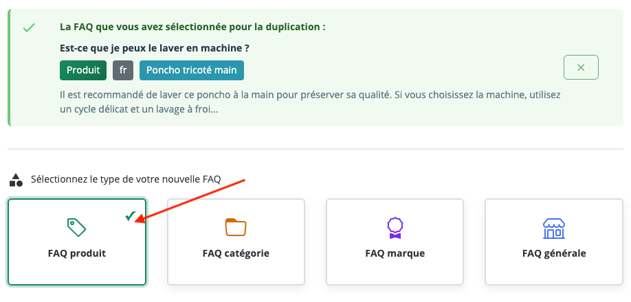 Avantages de la duplication : Cette méthode permet de gagner en qualité en apportant à l'IA des FAQ déjà validées par vos soins. En se basant sur ces contenus, et en analysant le nouveau contexte (différents produits, catégories, etc.), elle pourra optimiser la qualité des FAQ générées.