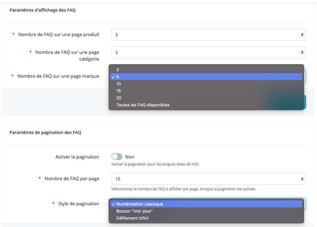 Configurez le nombre maximal de FAQ à afficher en fonction du type de page : produit, catégorie et marque. Activez, si vous le souhaitez, la pagination dans le cas d'un grand nombre de FAQ. Vous pouvez définir le nombre de FAQ par page et le style de pagination (numérotation classique, bouton "Voir plus" ou défilement infini).
