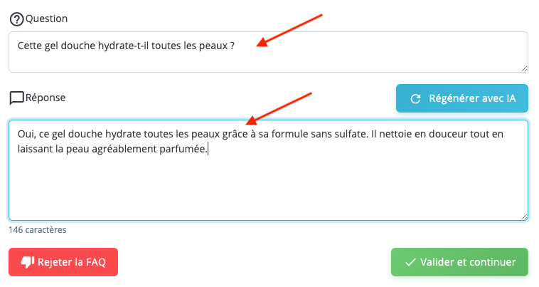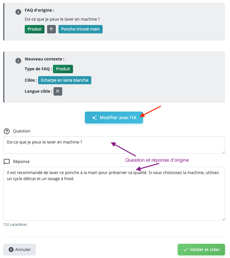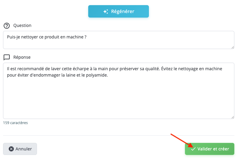 La nouvelle question et la nouvelle réponse, adaptées au nouveau contexte, s'affichent. Vous pouvez modifier manuellement ou régénérer avec l'IA si la question et/ou la réponse ne vous convien(nen)t pas, ou cliquer sur "Valider et créer" pour enregistrer et publier la nouvelle FAQ :