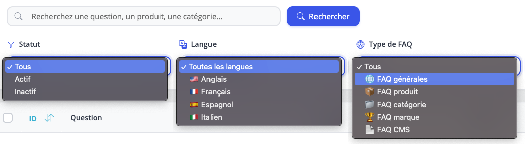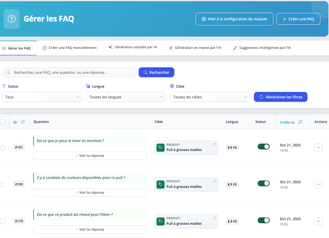 Le gestionnaire de FAQ offre des outils complets pour organiser, filtrer et gérer vos FAQ.