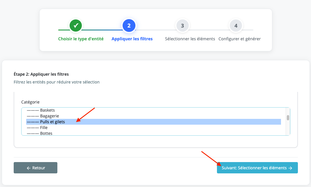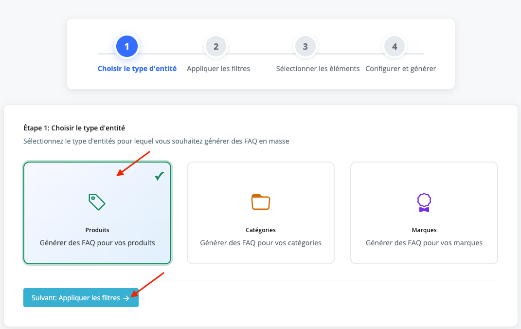 Commencez par sélectionner le type d'entités pour lequel vous voulez générer des FAQ en masse (dans l'exemple ci-dessous on a choisi de générer des FAQ pour plusieurs produits), puis cliquez sur "Suivant: Appliquer les filtres" :