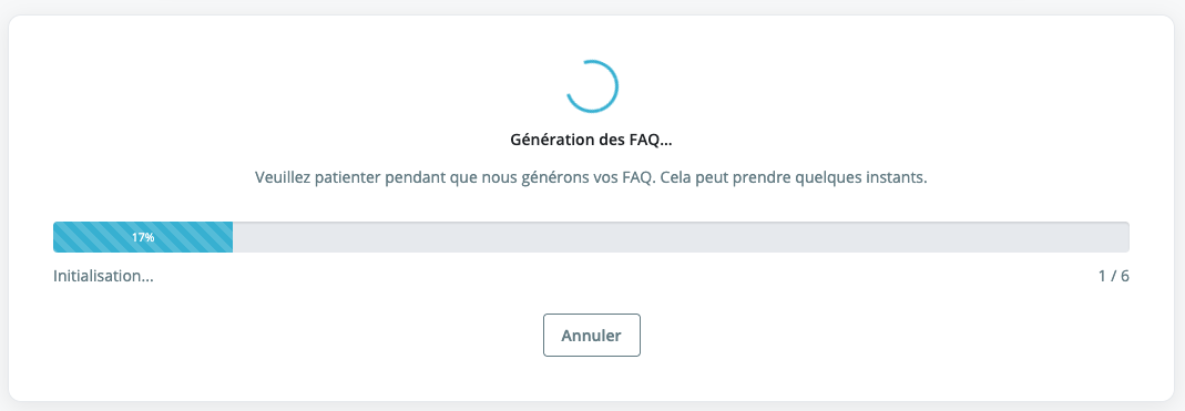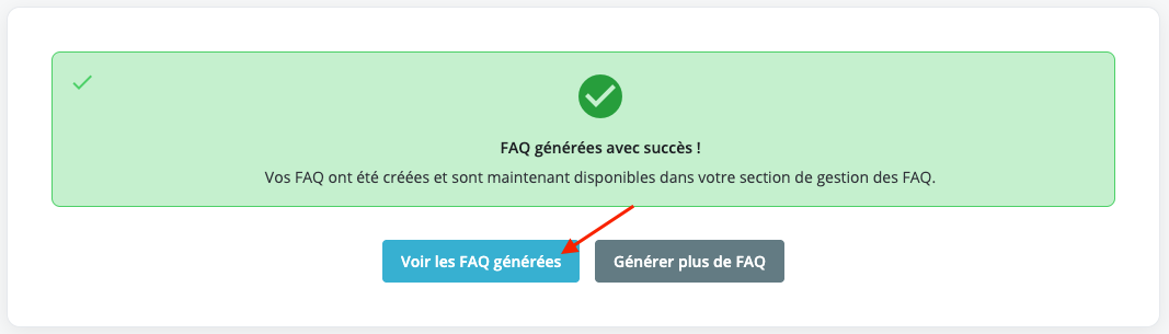Suivez l'évolution de la génération puis cliquez sur "Voir les FAQ générées" pour voir les nouvelles FAQ dans le gestionnaire :