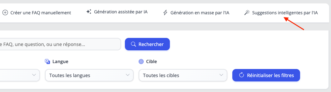 Dans le gestionnaire de FAQ, cliquez sur l'onglet Suggestions intelligentes par l'IA :