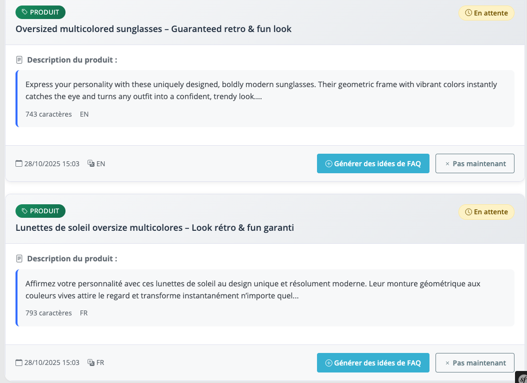 Exemple : ici on a créé un nouveau produit et on a rempli la description du produit dans 2 langues. On a donc 2 "éléments" (un par langue) sur lesquels l'IA peut suggérer des FAQ :