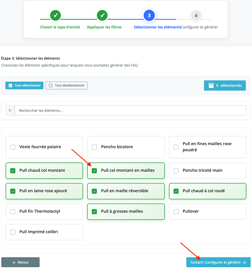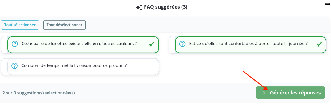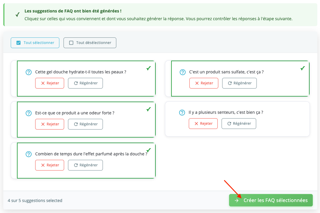 Désélectionnez celles qui ne vous conviennent pas. Laissez sélectionnées uniquement celles pour lesquelles vous voulez générer une réponse. Vous pourrez contrôler les réponses, et les modifier si besoin, à l'étape suivante. Cliquez sur "Créer les FAQ sélectionnées".