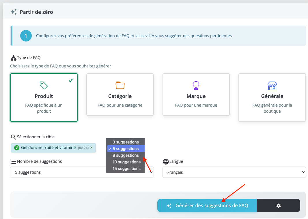 - Nombre de suggestions à demander à l'IA : 3, 5, 8, 10 ou 15 suggestions