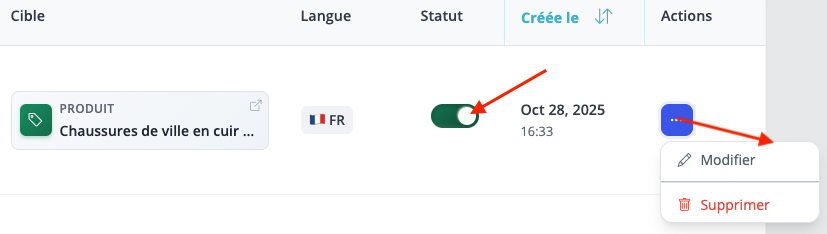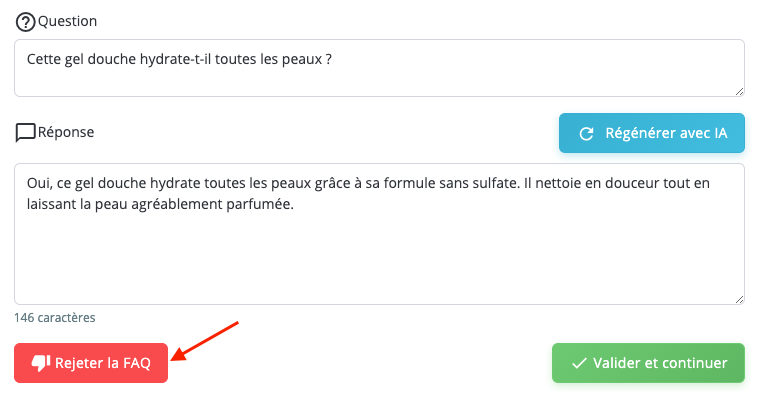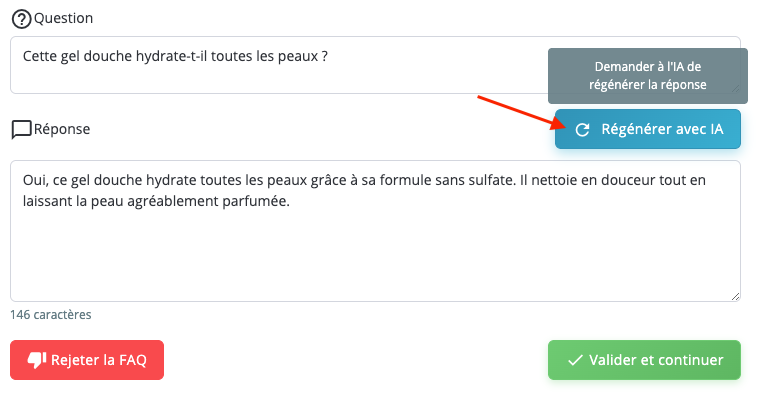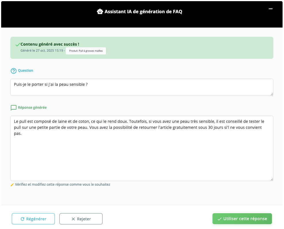 Cliquez sur "Régénérer" si la réponse ne vous convient pas et que vous voulez demander à l'IA d'en régénérer une, cliquez sur "Rejeter" si finalement vous voulez revenir à l'édition manuelle, ou validez en cliquant sur "Utiliser cette réponse". Vous avez toujours la possibilité de modifier encore les champs de votre FAQ après validation de la réponse générée par l'IA. - Activer la FAQ : publiez directement votre FAQ après enregistrement ou laissez-la désactivée pour une publication ultérieure.