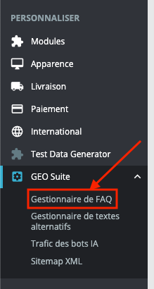 Rendez-vous dans l'onglet Gestionnaire de FAQ de la section GEO Suite dans le menu de gauche de votre back-office PrestaShop. Vous pouvez également y accéder à travers l'onglet FAQ > Configuration du module (bouton "Aller au gestionnaire de FAQ").