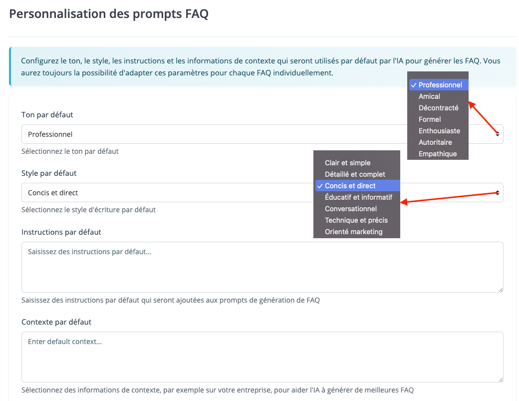 Configurez le ton (professionnel, amical, décontracté, formel, enthousiaste, autoritaire, empathique), le style (clair et simple, détaillé et complet, concis et direct, éducatif et informatif, conversationnel, technique et précis, orienté marketing), les instructions et les informations de contexte qui seront utilisés par défaut par l'IA pour générer les FAQ. Vous aurez toujours la possibilité d'adapter ces paramètres pour chaque FAQ individuellement, comme nous le verrons un peu plus loin.