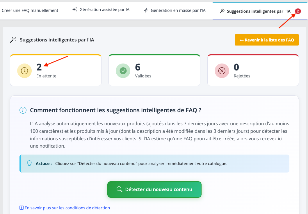 Lorsque l'IA détectera de nouvelles FAQ potentielles, un nombre s'affichera à côté du titre de l'onglet, correspondant au nombre de "contenus" créés ou modifiés sur lesquels l'IA est prête à faire des suggestions de FAQ.