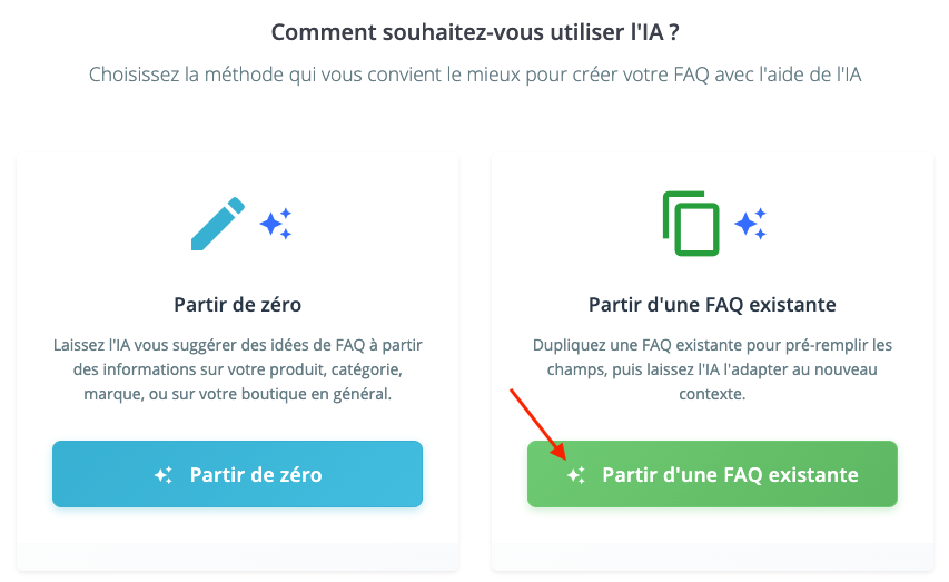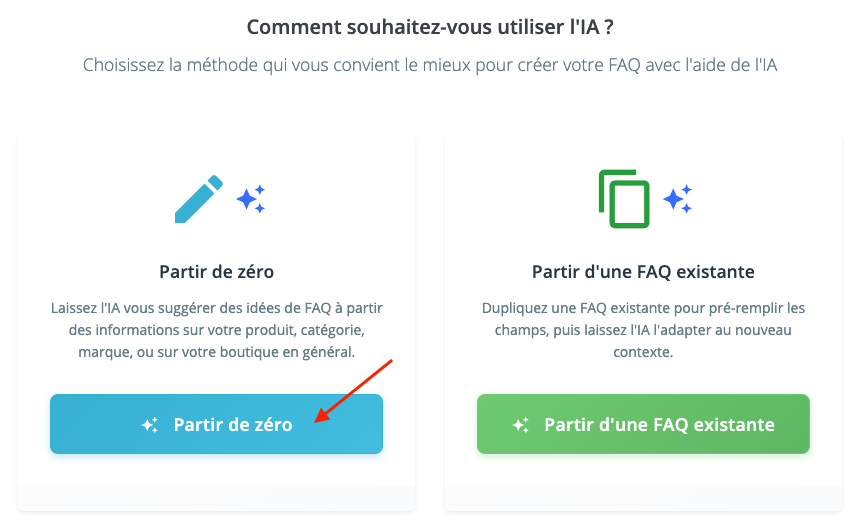 Choisissez votre méthode de création assistée par IA : décidez soit de "Partir de zéro", pour laisser l'IA vous suggérer des FAQ totalement nouvelles, soit de "Partir d'une FAQ existante" pour demander à l'IA d'adapter un contenu existant à un nouveau contexte.