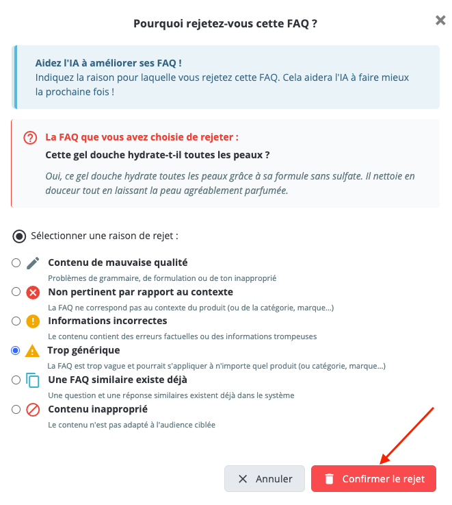 - Rejeter la FAQ si finalement elle ne vous convient pas. Dans ce cas, aidez l'IA à améliorer ses suggestions futures en donnant la raison de votre rejet :