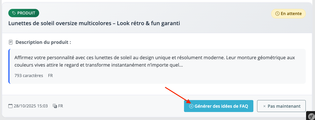 Pour chaque élément cliquez sur "Générer des idées de FAQ" puis confirmez la génération des suggestions :