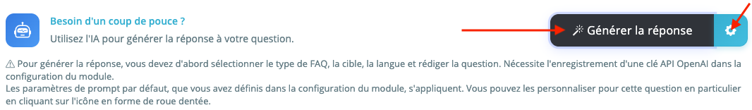 Si vous avez renseigné une clé API OpenAI dans le module, vous avez la possibilité ici de vous faire aider de l'IA pour la rédaction de la réponse. Dans ce cas, cliquer sur "Générer la réponse". Les paramètres de prompt par défaut, que vous avez définis dans la configuration du module, s'appliquent. Vous pouvez les personnaliser pour cette question en particulier en cliquant sur l'icône en forme de roue dentée.