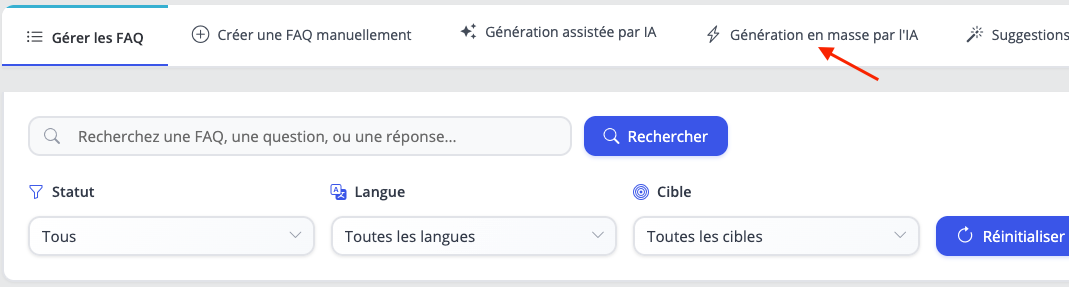 Depuis l'interface du gestionnaire de FAQ, cliquez sur l'onglet Génération en masse par l'IA :