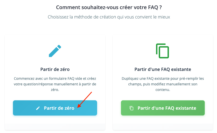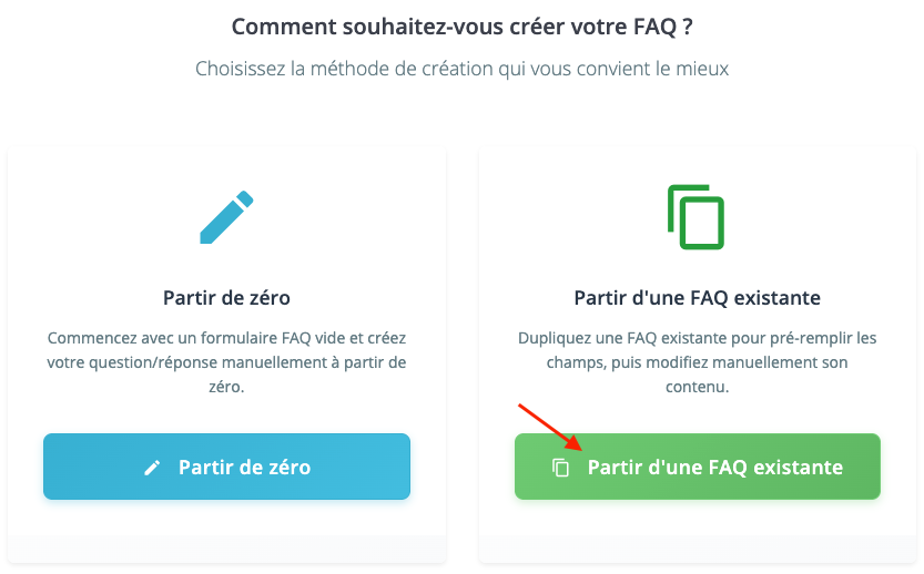 Choisissez votre méthode de création manuelle : décidez soit de "Partir de zéro", pour créer une FAQ complètement nouvelle, soit, de "Partir d'une FAQ existante" pour réutiliser le contenu d'une FAQ existante en l'adaptant à un autre contexte.