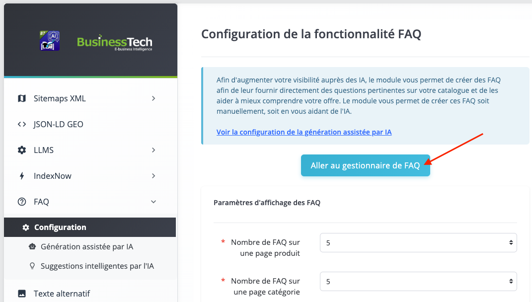 - Pour utiliser la génération en masse par l'lA, vous devez activer l'option "Génération assistée par IA" dans l'onglet FAQ > Génération assistée par IA du module (voir section précédente).