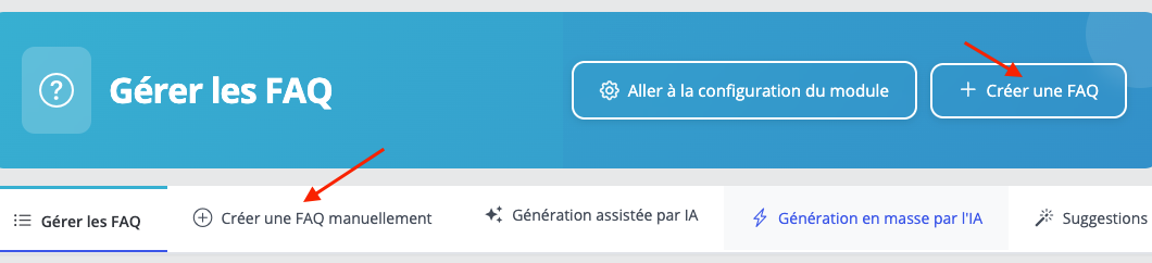 Depuis l'interface du gestionnaire de FAQ, cliquez sur l'onglet Créer une FAQ manuellement ou sur le bouton Créer une FAQ dans le bandeau bleu supérieur.