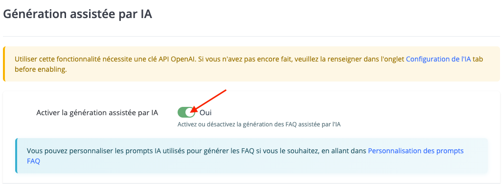 Commencez par activer la génération assistée par IA en vous rendant dans l'onglet FAQ > Génération assistée par IA :