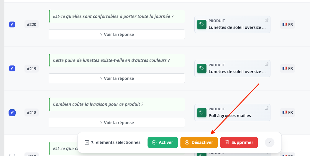 Sélectionnez plusieurs FAQ pour effectuer des actions groupées :
