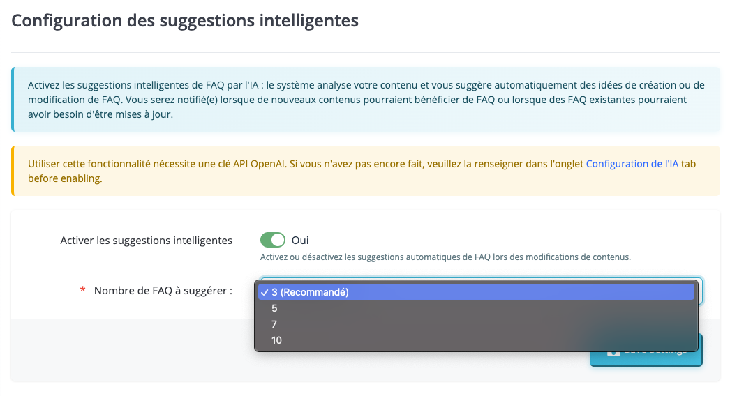 Commencez par activer les suggestions intelligentes en vous rendant dans l'onglet FAQ > Suggestions intelligentes par l'IA du module et configurez le nombre de FAQ à suggérer (on vous recommande 3 FAQ) :