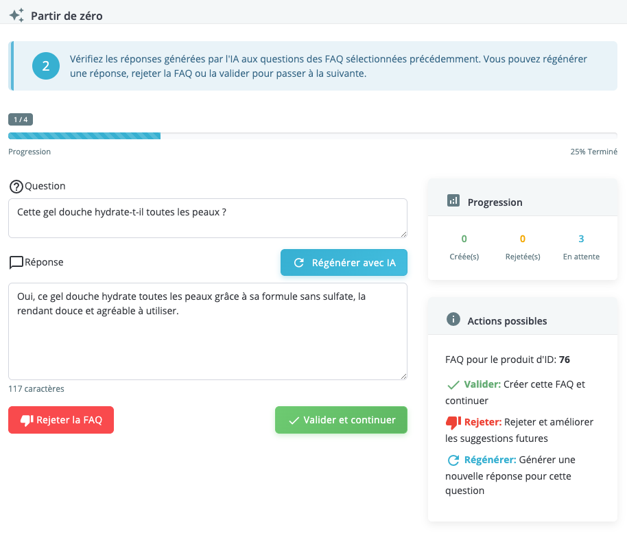 L'IA peut également vous aider à générer en masse vos FAQ pour un ou plusieurs produits, catégories ou marques.