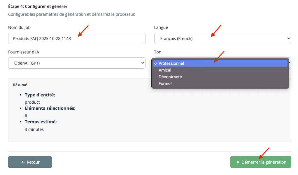 Donnez un nom pour la génération ou laissez celui pre-défini, choisissez la langue et la tonalité à adopter par l'IA puis cliquez sur "Démarrer la génération" :