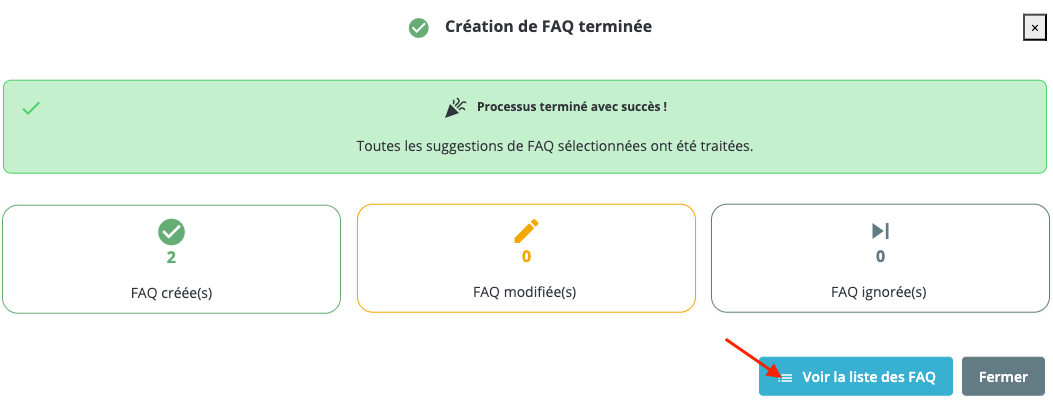 Cliquez enfin sur "Voir la liste des FAQ" pour revenir dans le gestionnaire de FAQ ou sur "Fermer" pour passer aux autres suggestions intelligentes.