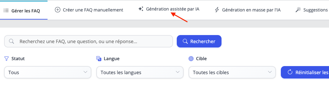 Depuis l'interface du gestionnaire de FAQ, cliquez sur l'onglet Génération assistée par IA :