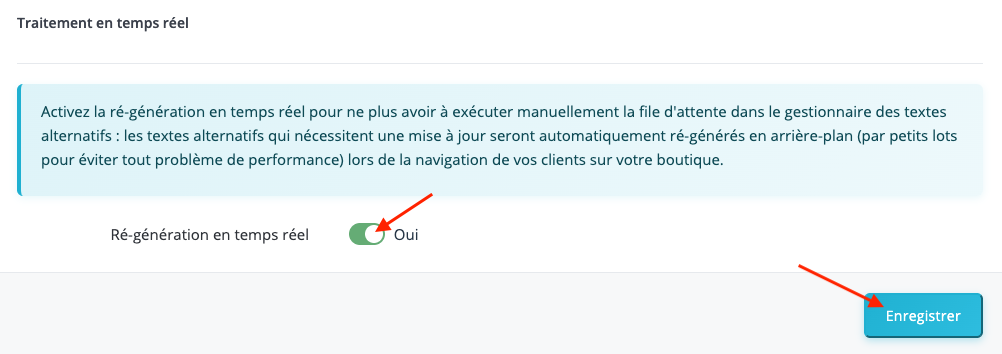 Activez la ré-génération en temps réel pour que les textes alternatifs qui nécessitent une mise à jour soient automatiquement ré-générés en arrière-plan lors de la navigation de vos clients sur votre boutique. Cela vous évitera d'avoir à exécuter manuellement la file d'attente dans le gestionnaire des textes alternatifs (voir section 3) pour les mettre à jour. Le traitement se fera par petits lots pour éviter tout problème de performance.