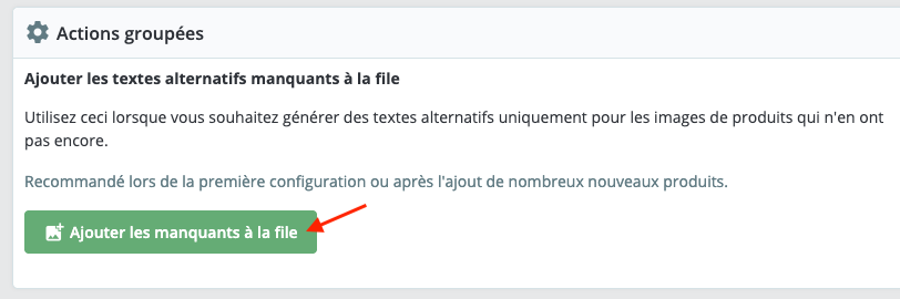 Vous pouvez également remplir vous même la file d'attente, de façon manuelle, à travers le gestionnaire de textes alternatifs. Pour cela rendez-vous dans l'onglet Gestionnaire de textes alternatifs du menu de gauche de votre back-office PrestaShop. Dans "Actions groupées", cliquez :